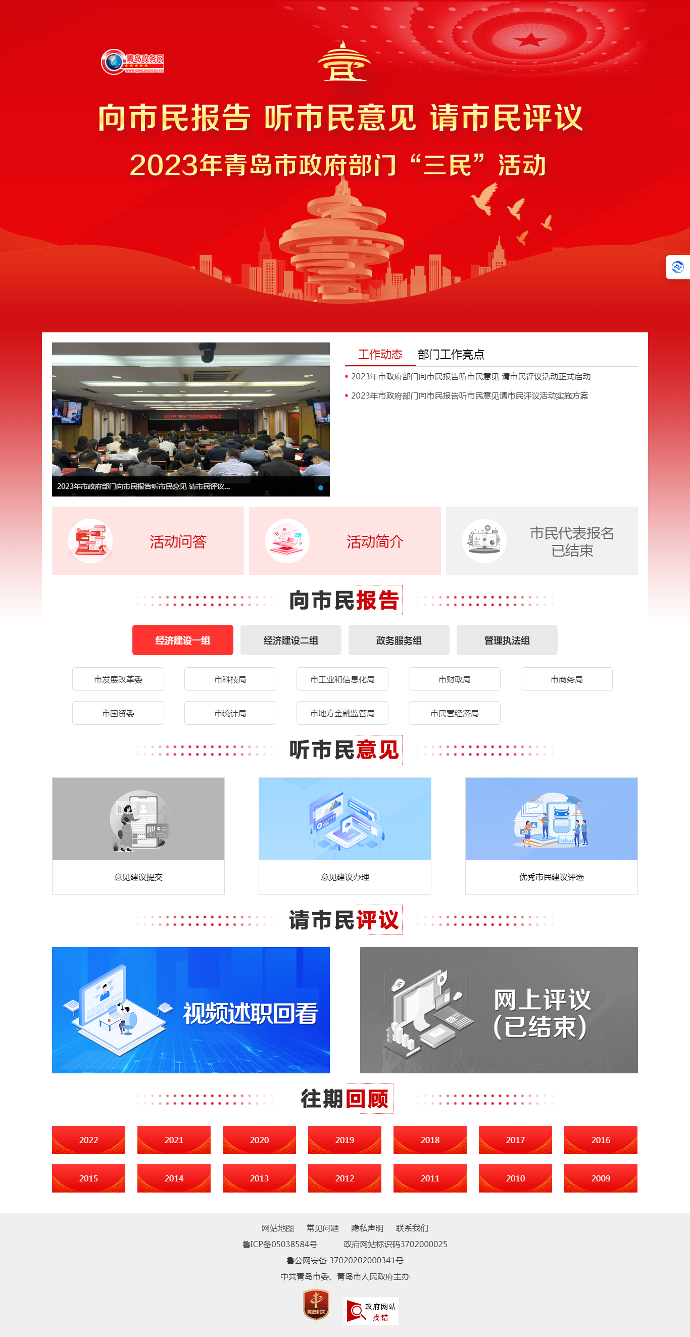 二是豐富政民互動(dòng)平臺(tái)。創(chuàng)新打造“青訴即辦”訴求解決平臺(tái),將政務(wù)公開工作與傾聽辦理群眾訴求相結(jié)合,快速解決群眾、市場主體和基層“民生、發(fā)展、執(zhí)法”三大類訴求。連續(xù)15年開展“向市民報(bào)告、聽市民意見、請(qǐng)市民評(píng)議”活動(dòng),繼續(xù)沿用線上“云述職、云評(píng)議、云征集”模式,組織38個(gè)政府部門通過“公開云述職”+“局長訪談”向市民報(bào)告工作,聽取意見建議。做好 “問政青島”“民生在線”“直通12345”等品牌欄目,發(fā)布“12345熱線指數(shù)”,為精準(zhǔn)解決民生問題提供了“風(fēng)向標(biāo)”。