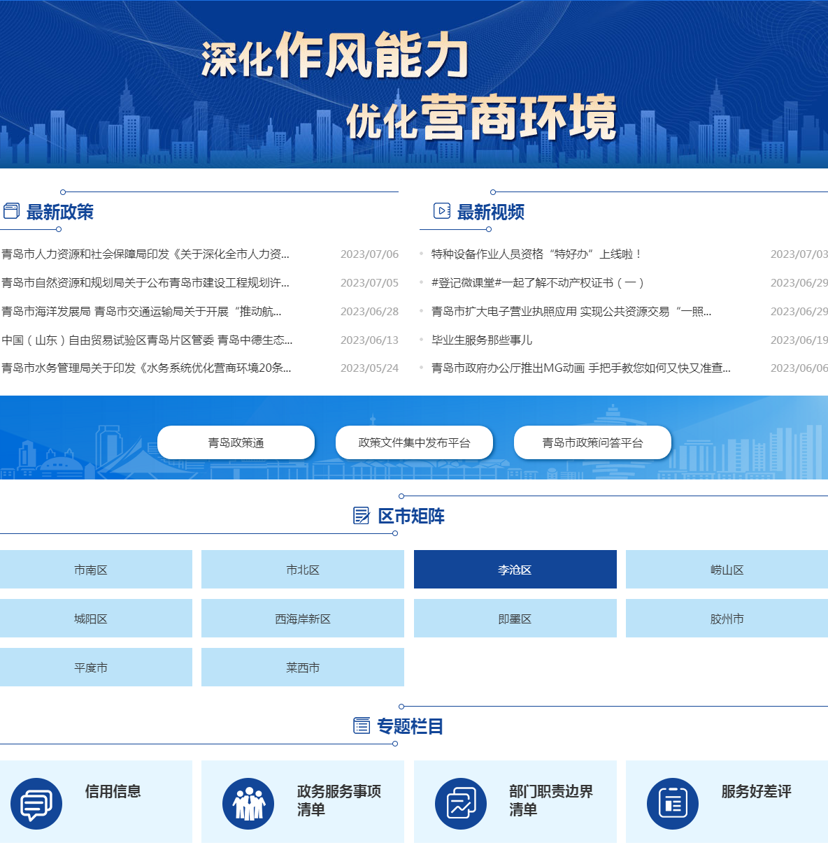 六是開設(shè)“優(yōu)化營商環(huán)境”專題專欄。設(shè)置“最新政策”“最新視頻”“區(qū)市矩陣”“專題欄目”四個(gè)欄目,整合發(fā)布各區(qū)(市)、各部門優(yōu)化營商環(huán)境方面的政策文件、政策解讀、視頻動(dòng)畫等內(nèi)容,多角度、多層次、全面生動(dòng)地向企業(yè)和群眾呈現(xiàn)近年來我市優(yōu)化營商環(huán)境的政策措施和特色亮點(diǎn),發(fā)布信息690余條,視頻97條。
